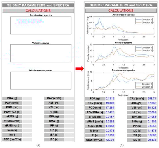 This panel is the first among the two panels used to present the intermediate results. More specifically, the panel “SEISMIC PARAMETERS and SPECTRA” is related to the presentation of the seismic and spectral parameters of the selected seismic excitations. As shown in Figure 8, the panel contains the push button entitled “CALCULATIONS”, which activates the connected external function (see Section 4.3) to calculate the acceleration, velocity, and displacement spectra for the two horizontal components of the seismic excitation (directions 1 and 2) and the corresponding (20) selected seismic parameters [,]. Diagrams with the calculated spectra are provided within the panel, along with the seismic parameters presented in “static text” GUI components (Figure 8).