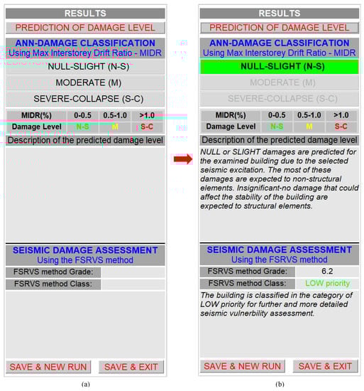 After selecting the trained ANN, the software activates the function that simulates this network and extracts the prediction regarding the SDC (i.e., the DS) of the studied RC building (see Section 4.3). This prediction is presented in the properly designed field of the panel (Figure 10). In addition, a short description of the extracted DS is presented in the corresponding static text area (Figure 10). The software also activates the function that performs all the required calculations for the rating of the studied RC building according to the FSRVS procedure. This rating as well as the classification of the studied building in categories with a view to prioritizing interventions (i.e., low, medium, or high) are also presented in the panel (Figure 10).