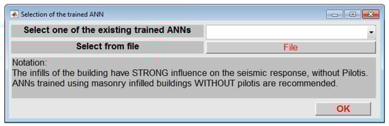 In Figure 11, detailed instructions for selecting the most suitable ANN for predicting the DS of the studied RC buildings are provided. These instructions are in line with the structural data inserted by the user (Figure 7). For example, suppose that structural parameters inserted by the user for the RC building studied are related to the existence of masonry infills at all stories except the ground story (i.e., RC building with pilotis), a notation will then appear in the window, suggesting the implementation of a compatible ANN (i.e., the implementation of an ANN trained using the dataset created for RC buildings with pilotis).