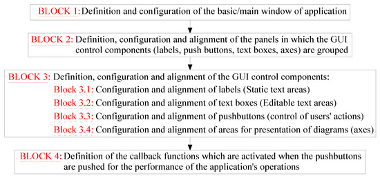 The source code of the application was developed on the basis of a central/main function that controls the other components/functions of the program (Figure 3). The basic operation of the main function is the programming of the main window and all the other windows of the GUI. In addition, the main function controls all functions of the program, which perform the required calculations, and manages the transferring of the data between them. In other words, the main function controls the insertion of the user data, calls the functions that (using the input data) calculate the intermediate and the final results, and manages their representation. The code of the main function is organized through different code “blocks”, which perform specific operations. These “blocks” are summarized in Figure 12.