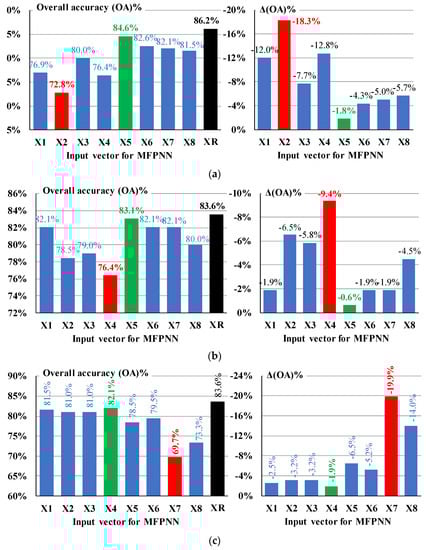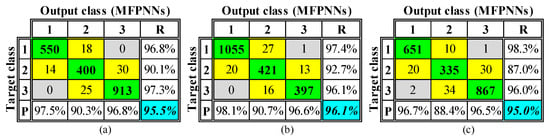 As already stated, the MFPNNs used in the current version of the developed software were trained using three SDCs. This approach is more compatible with RVI methods (as well as with the rapid damage assessment methods carried out after a strong earthquake), where the characterization of the seismic damage of buildings is not detailed. The MFPNNs were trained using three different training datasets created for three RC building classes, classified according to masonry infills’ existence. In particular, the classes considered are (a) buildings without masonry infills or with light masonry infills (bare buildings, BB), (b) buildings with masonry infills at all stories (masonry buildings MB), and (c) buildings with masonry infills at all stories except the ground story (buildings with pilotis, PB). More details about the training procedure of these networks are given in []. Based on the above, the current version of the software has built-in three trained MFPNNs (see also Section 4.2.4). The optimum configuration of the used MFPNNs is presented in Figure 2.