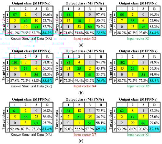 - The type and number of the characteristics of the objects (i.e., the input x vectors) should be selected and classified into pre-defined classes. Furthermore, the corresponding classes’ number and type should also be defined (i.e., the output o vectors). An important issue, which is also briefly described in Figure 1, is the mapping of output vectors (oj elements) to the classes of the problem. More specifically, the configuration of o vectors for each one of the pre-defined classes must be defined. By definition, when the MFPNN extracts an output vector o with oj = 1 and all the other elements of o are equal to 0, then the corresponding object (x vector) is classified to the class j. For the seismic damage assessment, the input vectors x should contain parameters that are crucial for the seismic performance of the RC buildings (structural parameters), as well as parameters that describe the seismic excitation (seismic parameters) []. To this end, the input vector x consists of two sub-vectors, namely the sub-vector xstruct and the sub-vector xseism (Equation (1)):