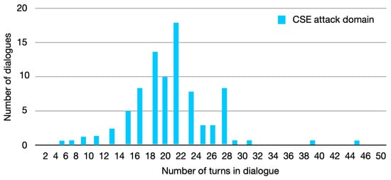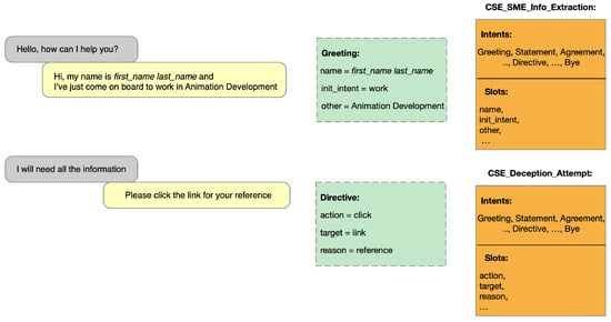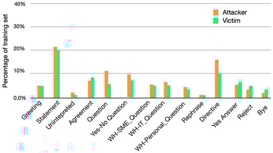Given the inherent differences between CSE attack dialogues and standard dialogues, a carefully designed set of dialogue-act labels is necessary to meet the requirements of CSE attack recognition. These dialogue acts should be able to capture the intentions of the attacker while remaining easily understandable. To create a set of appropriate dialogue acts, the utterances of both interlocutors in the CSE corpus [17] were analyzed, classified, and combined into pairs. Building on Young’s paradigm outlined in [32], we propose a set of fourteen dialogue acts. Each SG-CSE DA is represented by an intent slot and has a data type and a set of values that it can take. The full list of the dialogue acts is presented in the following table (Table 3). The percentage of each dialogue act frequency is also given in the last column for the total number of utterances in the SG-CSE Corpus.