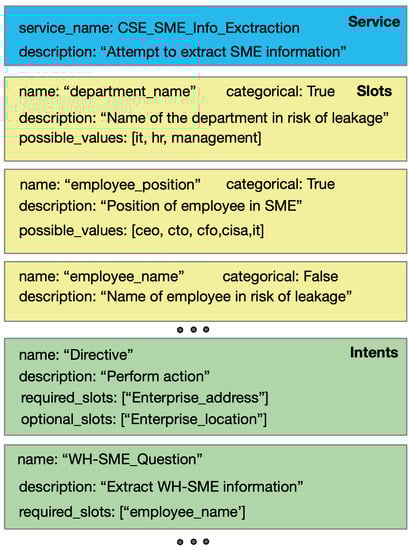 The schema-guided paradigm makes use of a domain’s ontology to create the required schema that describes each service existing in the domain. In our research, the domain is the CSE attacks, and we predict the service, user intention, and requested slot-value pairs. For example, for an utterance like: “What is the CEO’s first name?” the SG-CSE BERT model should be able to build a representation like the one presented in Table 2.