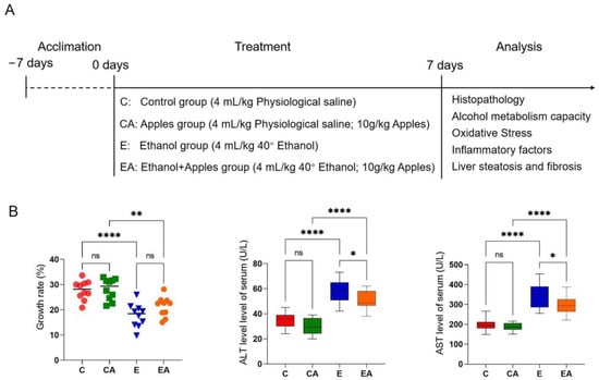 The aim of this study was to investigate the protective effect of apple consumption on ALD, using multiple aspects such as serum markers, liver tissue sections, alcohol metabolism indicators, OS indicators, and inflammatory factor indicators to assess liver damage and effects (Figure 1A).