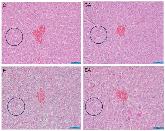 Sections of rat liver tissue between different treatments. Hematoxylin-eosin-stained sections (800× magnification). Bar = 50 μm. Control group (C), control group fed fresh apples (CA), ethanol-treated group (E), and ethanol-treated group fed fresh apples (EA).