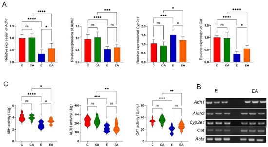 Gene expression and enzyme activity of alcohol metabolism in rat liver. (A) Analysis of the gene expression levels of alcohol dehydrogenase 1 (Adh1), aldehyde dehydrogenase 1 family, member A1 (Aldh2), cytochrome P450, family 2, subfamily e, polypeptide 1 (Cyp2e1), and catalase (Cat) in liver tissues by real-time quantitative polymerase chain reaction (RT-qPCR). (B) Semi-quantitative real-time polymerase chain reaction (sPCR) to verify differential expression of Adh1, Aldh2, Cyp2e1, and Cat in the E and EA groups. Actx was used as a housekeeping gene. (C) Enzymatic activities of alcohol dehydrogenase (ADH), acetaldehyde dehydrogenase (ALDH), and catalase (CAT) in rat liver tissues. ns: p > 0.05, *: p < 0.05, **: p < 0.01, ***: p < 0.001, ****: p < 0.0001.