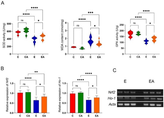 Genes expression and enzyme activity of oxidative stress in rat liver. (A) Superoxide dismutase (SOD) activity, glutathione peroxidase (GPx) activity, and the levels of malondialdehyde (MDA). (B) Analysis of the gene expression levels of nuclear factor erythroid-derived 2-like 2 (Nrf2) and heme oxygenase 1 (Ho-1) in liver tissues by RT-qPCR. (C) sPCR to verify differential expression of Nrf2 and Ho-1 in the E and EA groups. ns: p > 0.05, *: p < 0.05, **: p < 0.01, ***: p < 0.001, ****: p < 0.0001.
