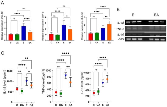 Gene expression and protein levels of inflammation-related to rat liver tissue. (A) Analysis of the gene expression levels of interleukin 1 (IL-1β), tumor necrosis factor (TNF-α), and interleukin 10 (IL-10) in liver tissues by RT-qPCR. (B) sPCR to verify differential expression of IL-1β, TNF-α, and IL-10 in the E and EA groups. (C) Protein levels of interleukin 1 (IL-1β), tumor necrosis factor (TNF-α), and interleukin 10 (IL-10) in rat liver. ns: p > 0.05, *: p < 0.05, **: p < 0.01, ****: p < 0.0001.