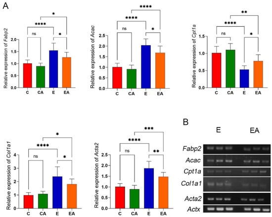 Gene expression levels of involved in lipid metabolism and liver fibrosis. (A) Analysis of the gene expression levels of fatty acid-binding protein 2 (Fabp2), acetyl-CoA carboxylase alpha (Acac), carnitine palmitoyltransferase 1A (Cpt1a), collagen type I alpha 1 chain (Col1a1), and alpha-2 smooth muscle actin (Acta2) in liver tissues by RT-qPCR. (B) sPCR to verify differential expression of Fabp2, Acac, Cpt1a, Col1a1, and Acta2 in the E and EA groups. ns: p > 0.05, *: p < 0.05, **: p < 0.01, ***: p < 0.001, ****: p < 0.0001.