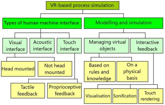 The first classification is the types of human–machine interfaces, which are visual, acoustic, and touch interfaces. The visual interface is classified as head-mounted and not head-mounted. Touch interface should be defined as tactile feedback and proprioceptive feedback. Modelling and simulation are used with methods managing virtual objects and interactive feedback. Managing virtual objects are known to be based on rules and knowledge and on a physical basis. Interactive feedback uses such methods as visualization, sonification and touch rendering [,,].