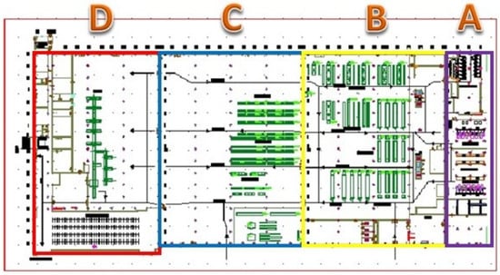 Figure 3 shows a hall divided into four sectors, which are separated by colors. The production takes place from right to left. It starts in sector A, which is marked in purple. This sector is located one floor above the other three sectors. In sector A, a synthetic fiber is produced from granulate, which is melted under high pressure and at high temperature and extruded through the so-called nozzles (metal circular plates with a number of small holes in a circular shape) in cooling shafts that go from sector A to a floor below to another sector. In these shafts, the produced fiber is cooled, and it slowly descends to the fiber treatment machines located in sector B.
