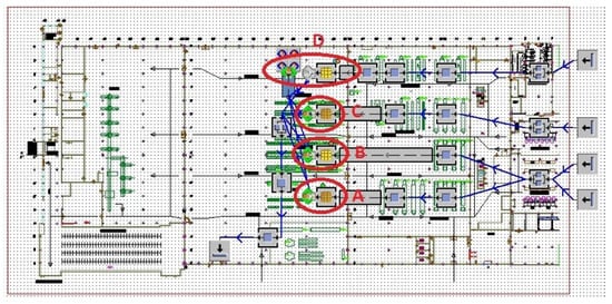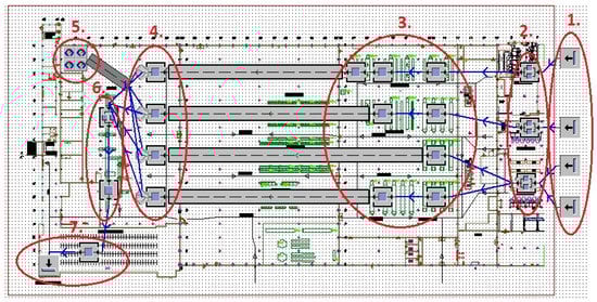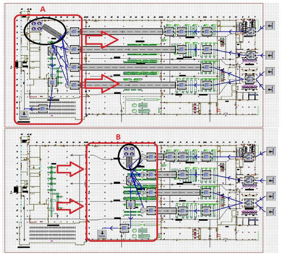 For the simulation of the production process, we used the PLM software Tecnomatrix Plant Simulation, which was developed for this purpose. The process was simulated in 2D and the program used a drawing of the production hall of the selected organization as a basis for the layout of individual machines, lines, and conveyor belts according to the actual layout. Figure 4 shows the model of the whole production process in the hall of the organization, along with the marked direction of material flow. Then, in order to highlight the ongoing activities and processes and provide a smooth transition to the simulation, we describe the actual production activity taking place on the production floor.