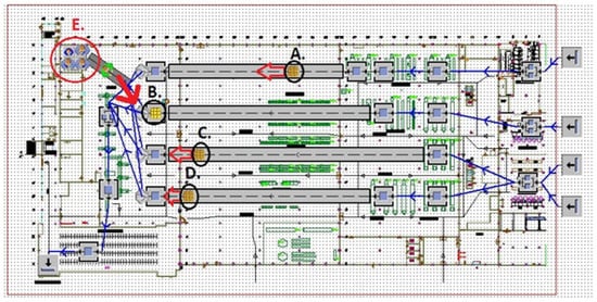 Through sector C, which is marked in blue, the fiber passes on conveyor belts further to sector D. This part of the hall serves only to move the fibers from one process to another. In sector D, marked in red, the inspection of fibers is performed together with the subsequent packaging of individual spools and the packaging of entire pallets. Sector D also includes the organization’s storage facilities and the dispatch of goods. In Figure 3, it is possible to see the direction of material flow, which is shown by the black arrows.