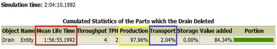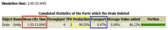 After the simulation, Tecnomatix Plant Simulation can generate a lot of information about the simulation, graphs, tables and statistics. A very important piece of information is the duration of the entire production process, which is marked in red in Figure 6.