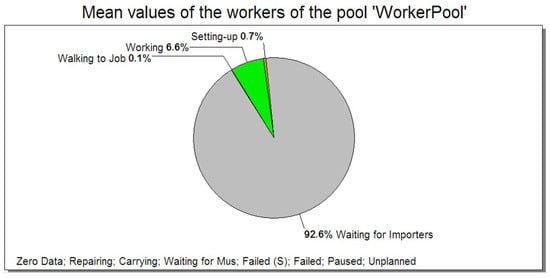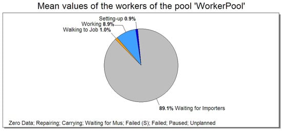 A relocation of individual workplaces and a more efficiently located place reserved for inspectors should also be reflected in the results of the simulation. To compare the statistics of the inspectors and their activities during the production process, Figure 11 shows the percentage distribution of the controller’s activities over the duration of the entire production process.