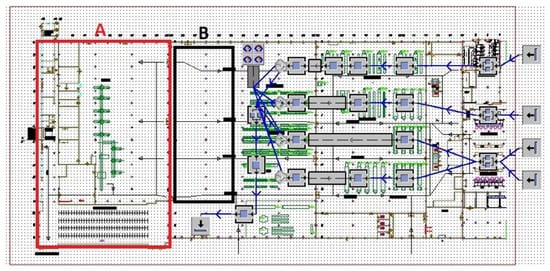 Part of the hall where the machines for the processes of inspection, packaging, storage and dispatch of the product were originally located remained empty. It is marked in red and with the letter “A” in Figure 12. In addition, after applying the principle of lean production, almost half of the space in the central part of the production hall remained empty. This space is marked in the picture in black and with the letter B.