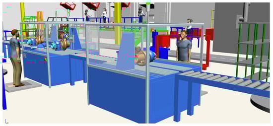 The presented detail of view using virtual reality with Siemens PLM system Tecnomatix is shown in Figure 13. It presents the manager‘s view of the chosen part of the digital factory, and the manager can check the online data. With the use of virtual reality, the manager can view the processes from various working positions in this factory. He can have a view of all positions of machines, lines, and staff and their ergonomic comfort as well as safety. All these data can be used for planning and calculating, and in the end, it shows the economic work of this company. It is a useful strategy for starting innovative processes in every part of the factory. The processes can also include the training of staff and the updating of all health and safety manuals, and it will be a starting point for the energy-saving strategy of the company. The process of simulating a digital factory ends with setting up a whole new set of rules that allow people to work differently.