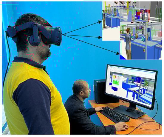 Virtual reality (VR) and human simulation in digital manufacturing emerged as a result of developments in digital mockup simulation technologies during the 1990s. The development of DMU has led to a new paradigm that integrates processes, resources, knowledge, and simulation models []. Despite the constraints of our physical world, virtual reality (VR) can also creatively display complex content or useful data []. The improvement of collaborative practices in 3D virtual worlds with VR with a focus on the education and manufacturing sectors in the smart factory is one of the goals of this paper. This goal is based on the fact that features of the real environment can be replicated in the virtual world through a digital twin and new, customizable, and valuable ways of working []. Virtual reality (VR) is an artificially created, unreal digital world that is used in an interactive virtual setting. Immersion and presence are its two key components, and it is intended to mimic real life []. The degree of objective sensory fidelity offered by a VR device is what is meant by immersion. Each user feels their presence as a result of being fully immersed in the digital world [,].