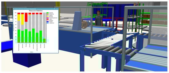 Figure 15 shows the view from the VR, which is available to the engineer. He views the position where an employee is working. In the left corner, he can see the online data that are providing information about the production process of the line. All of the statistical data can be further processed, analyzed, and used for the creation of measures in a table. It is possible to further work with this data in order to evaluate the processes that are already in place, suggest changes, implement them in the digital factory, re-simulate them, and, once the desired results have been attained, introduce them right into production.