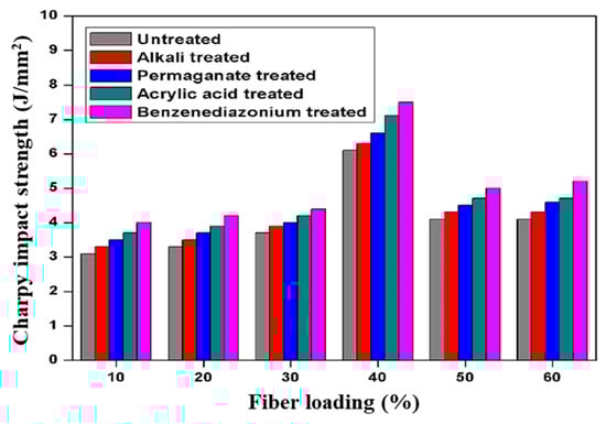 The impact energy of the materials is the resistance against the high-speed stress or material’s toughness. The composite’s ability to store energy during plastic deformation is improved as additional fibers are added because more energy will be required to break fiber bundles [18]. A comparative study between treated and untreated banana/epoxy composites was performed by Venkateshwaran et al. [87]. The impact strength of treated banana/epoxy composites increased at 1% NaOH concentration. Punyamurthy et al. [110] studied the effect of fiber loading (10, 20, 30, 40, 50, and 60 wt.%.) and surface modification techniques such as alkali (6%), acrylic acid (1%), permanganate treatment (0.5%), and benzene-diazonium chloride on the impact strength of the abaca-reinforced epoxy composite. The benzene-diazonium chloride-treated fiber epoxy composites showed better impact characteristics. The untreated fiber composites showed poor impact characteristics, irrespective of fiber loading. The chemical treatment improved the fiber–matrix adhesion by removing non-cellulosic components and adding hydroxyl (-OH) groups. The 40 wt.% of fiber loading showed better distribution in the matrix composite, low fractures, and better load transfer from fiber to the matrix. However, beyond 40 wt.% fiber loading, the impact strength decreased due to poor bonding and less load transfer from the matrix to fibers (Figure 2). The effect of alkali and silanized woven sisal fibers on the mechanical properties of natural rubber/epoxy composites was investigated by Srisuwana et al. [111]. They observed that grafted depolymerized natural rubber with 1 wt.% methyl methacrylate/glycidyl methacrylate had a 163% greater impact stregth value than epoxy resin. Olaitan et al. [101] performed a comparative study between groundnut shell and rice husk epoxy composites with different fiber loadings. The groundnut shell-reinforced epoxy composites showed superior mechanical characteristics compared to the rice husk-reinforced epoxy composites. Low-velocity impact behaviour of hemp–basalt/epoxy-reinforced composites was studied by Kumar et al. [112]. The results indicated better impact behaviour of hybrid composites than hemp and basalt-reinforced composites. The impact strength of NFRCs can be improved by proper chemical and physical treatments [113]. The fracture progresses along with the fiber–matrix interface in composites with poor interfacial bonding, causing debonding and substantially improving the composites’ energy absorption capabilities. The good adhesion between the fiber and the matrix is responsible for better fracture resistance under impact loading [114]. Fiber loading can also improve the energy absorption capability of the fibers.