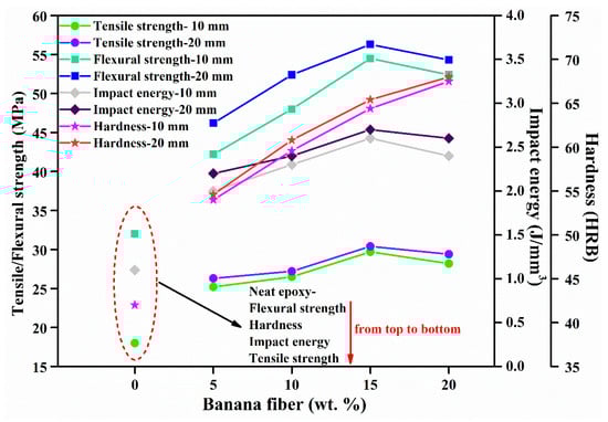 Figure 3 represents the effect of fiber loading and length on the mechanical behaviour of banana fiber-reinforced epoxy composites. The mechanical properties such as tensile strength, flexural strength, hardness, and impact strength increased with fiber loading (up to 15 wt.%). However, with a further increase in fiber loading, mechanical properties decreased, with the exception of hardness, due to the hard and brittle nature of the banana fibers. The decrease in mechanical properties with fiber loading (after 15 wt.%) was due to the wetting of fibers resulting in poor stress transfer between the surfaces of fibers [94].