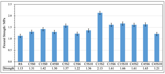 The flexural strength of each mix is presented in Figure 3 and the changes in flexural performance due to the addition of nanomaterials are recorded in percentages as is shown in Figure 4. Figure 5 exhibits four representative samples after the flexural test. After failure, the surfaces of specimens C5S0 and C15S2 displayed comparatively less roughness than C45S10 and RS which were also of high spalling. This addressed the lower strength values obtained in the experiment for samples C45S10 and RS. The original data of the flexural strength test are recorded in Table A1, together with the standard deviation and weighting factors. T-test values are presented in Table A2. It can be clearly seen from Figure 3 and Figure 4 that positive results were obtained in the experiments for the modified specimens, proving that the presence of nanomaterials effectively ameliorated the flexural capacity of LWCM with FAC. This is attributed to the outstanding characteristics of CNTs and NS which can greatly improve the hydration reaction and microstructure of LWCM. For sample C15S2, the maximal flexural strength of 2.13 MPa was measured, with an 89.02% increase compared to the control mix (1.13 MPa), while specimen C45S10 showed the lowest enhancement of flexural strength, with only 7.53% of growth to 1.21 MPa. Other dosages of nano additives contributed to the strength development of LWCM within the range of 10% to 50%.