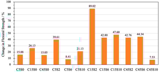 The dosage of 0.2% NS bcw shows a moderately better modifying impact than other dosages, which highlights that 0.2% content of NS in the hybrid additives is optimal for the enhancement of flexural strength. For samples containing constant 0.15% CNTS, the incorporation of NS in three dosages all accounted for the further enhancement of flexural strength, with the most impressive increase, 49.95%, measured for the sample C15S2. Reductions of strength were only observed for samples C5S6 and C45S10, in contrast with the specimens without NS. This shows that the use of NS cannot always lead to further improvement of flexural performance in binary usage together with CNTs. The initial strength improvement of adding 0.2% NS is related to the ameliorated adhesion between cement matrix and CNTs, but with the growing amount of NS added to LWCM, the tendency of NS to absorb water leads to an incomplete hydration reaction, negatively affecting strength [24,59,60].