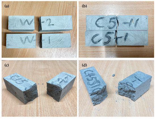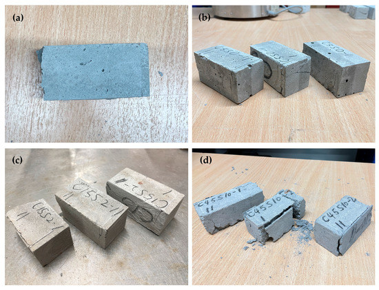Degradation of representative specimens after the flexural test: (a) RS; (b) C5S0; (c) C15S2; (d) C45S10.