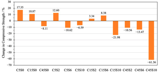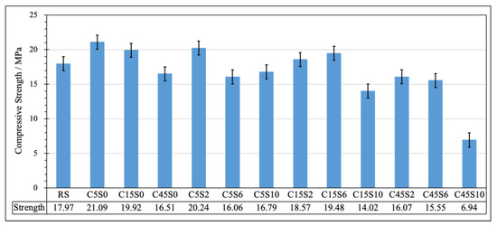 The compressive strength of LWCM is recorded in Figure 6 for each mix, and the percentage changes in strength are exhibited in Figure 7. The original data from the compressive strength test are presented in Table A3, along with the values of standard deviation and weighting factors of each data group. T-test values were calculated in Table A4. Figure 8 displays the crack patterns of specimens RS, C5S0, C15S2, and C45S10 after compressive strength tests. It can be seen that compared to the other three specimens, sample C45S10 showed the greatest degradation after loading, corresponding to its lowest strength value.