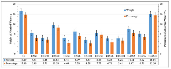 Water absorption of concrete indicates the durability of cement materials and is correlated to pore structure as well as the microvoids existing in the hardened concrete [63,64]. The original data from the water absorption tests are recorded in Appendix A (Table A5, Table A6 and Table A7). In Figure 9, the characteristics of water absorption of LWCM are assessed via the weight of absorbed water, as well as the percentage of absorbed water, which is the percentage ratio of the weight difference to the dry weight [38]. The weight difference is the value between the sample weight after submerging into the water and the weight after drying up. As can be seen in the bar graph, in contrast with the referencing specimen, with 17.2 g of water absorbed in the test, the addition of nanomaterials contributed to the decline of water absorbed by the LWCM on different levels. The specimen C45S10 exhibited the lowest decrease in water absorption, of approximately 1.2 g, showing that at high dosage, the synergic incorporation of CNTs and NS failed to reduce the number of microvoids in the cement mortar. This also addresses the high weight of absorbed water (11.5 g) in the sample including only 0.45% of CNTs. Another reason can be ascribed to the nature of nanomaterials that require a high amount of water. Specimen C5S10 shows the lowest percentage of water absorption, 4.3%, demonstrating that the synergic presence of nano additives at a proper amount is effective for improving the pore structure of cement mortar and decreasing porosity. No obvious trend was observed between the amount of NS or CNTs and the water absorption capacity in the sample. Only when the CNTs content is constant at 0.05% and 0.15% were average greater synergic effects measured.