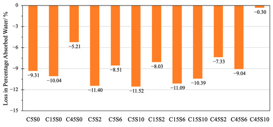 Figure 10 illustrates the change in the percentage water absorbed in comparison with the reference sample. On average, specimens with 0.05% and 0.15% of CNTs displayed comparatively higher loss in percentage water absorption, with the most remarkable value observed for samples C5S2 and C5S10, with 11.40% and 11.52%, respectively. This can be associated with the increasingly dense microstructure due to the incorporation of nanofillers at a proper dosage. The changing values varied within the range from 7% to 12%, except specimens C45S0 and C45S10, which exhibited a high percentage of water absorption, with only 5.21% and 0.30% of loss, respectively. This can be related to the loose morphology of the two specimens, as is proven in the SEM images.