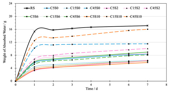 - The incorporation of nano additives accounted for the reduction of absorbed water of modified specimens. Sample C5S2 showed the greatest decrease in the percentage of absorbed water, viz., 11.40%. This can be related to the increasingly dense and homogeneous microstructure. Sample C45S10 showed the lowest reduction of absorbed water, with only a decrease of 0.30%. For all the samples, the capacity of absorbing water reached saturation at an early stage within 24 h, after which the increment of water absorbed was very limited;