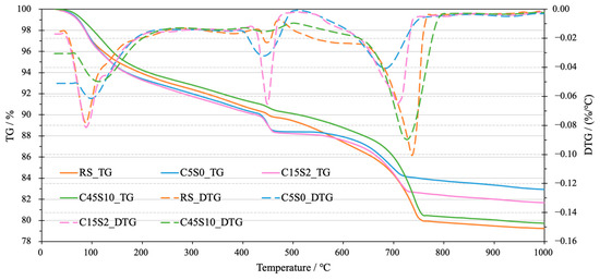 Thermalgravimetric analysis was carried out on specimens RS, C5S0, C15S2, and C45S10 to evaluate the characteristics of substances and the material transformations during the hydration process. The aim of the test was to reveal the synergic impacts of CNTs and NS on the cement hydration reaction, especially their effects as nucleation sites. According to Yao and Lu [54], as well as Jung et al. [65], the main reasons resulting in the loss of sample weight during the increment process of temperature are the evaporation of free water in the cement matrix as well as the dehydration of bound water from hydration products and their decomposition. Figure 12 illustrates the thermogravimetric (TG) and differential thermogravimetric (DTG) curves acquired in the tests from room temperature to 1000 °C. Along with the increase of ambient temperature, three characteristic peaks in each curve appear at the temperature range from 50 to 230 °C, 400 to 500 °C, and 630 to 780 °C. The occurrence of the representative peaks of weight loss indicates the important transformation of hydration products. The mass change within the temperature scope between 50 to 230 °C is related to the volatilization of free water from the LWCM [54], as well as the decomposition of hydrates, especially CSH [65,66,67]. The second peak in the range of temperature rising from 400 to 500 °C can be characterized by the dehydration of hydration product CH from LWCM [54,68], and the peak with temperature varying from 630 to 780 °C is ascribed to the decomposition phase of calcium carbonate (CaCO3) [54,67].