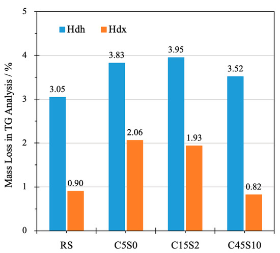 According to Carriço et al. [66] and Alarcon-Ruiz et al. [68], the loss of weight in the initial two temperature extents (100–230 °C and 400–500 °C) can approximately represent the degree of hydrate dehydration (Hdh) and dihydroxylation (Hdx) during the cement hydration process, respectively. In Figure 13, the values of Hdh and Hdx were calculated and presented. Compared to the control specimen (3.05% Hdh and 0.90% Hdx), samples C5S0 and C15S2 exhibited both higher dehydration and dihydroxylation values, with increments of 22.57% and 29.51% for Hdh, as well as 128.18% and 113.97% for Hdx. This confirms the existing higher hydration degree in LWCM due to the incorporation of CNTs and CNT-NS additives, resulting in an increasing amount of hydration products. This is associated with the effects of CNTs and NS acting as nucleation sites and activators, providing an auxiliary environment and promoting the process of hydration as well as the formation of hydrates. The greatest Hdh value, 3.95% was measured for sample C15S2, which demonstrates that the presence of NS led to developed synergic influence and further improved cement hydration, resulting in a higher amount of CSH generated. Sample C5S0 showed the most remarkable Hdx value of 2.06%, indicating the decreased amount of CH in the hydration with the inclusion of NS. This can be related to the silica pozzolanic reaction of NS which consumes CH and produces CSH during the hydration process [59]. Another point worth noticing is that for sample C45S10, the Hdh value showed the least increment compared to the other two modified samples, and the Hdx value was even lower than that of the control specimen, showing the limited improvement in hydration degree and fewer generated hydrates. This decline of CSH and CH can be ascribed to the great water demand for nanomaterials that compete with cement for water during the hydration process. Further, the agglomeration of CNTs and NS at high dosage is another thing that can hinder cement hydration.