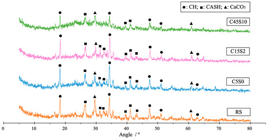 In Figure 15, the XRD patterns of the representative specimens RS, C5S0, C45S10, and C15S2 are presented. According to Liew et al. [70] as well as Yao and Lu [54], the improvement of the mechanical performance of modified cement-based materials is affected by both the physical interaction between nano additives and cementitious matrix, and also the chemical transformation during the hydration reaction. The objective of the experiment was to reveal the influence of NS and CNTs on the transformation of chemical compositions owing to the hydration process. The chemical identification of the peaks was carried out via XRD analysis software HighScore Plus 3.0 and relevant literature sources [54,67,71,72,73].