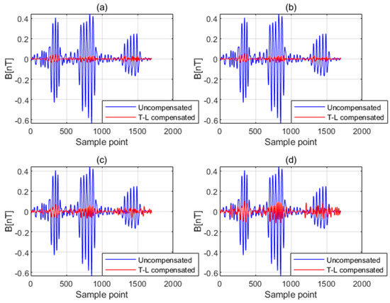 The time−domain waveforms of the interfered magnetic field before and after compensation when (a) noise is not added, (b) the Gaussian white noise with an amplitude of 1% of the stability amplitude of the fluxgate magnetic field is added, (c) the Gaussian white noise with an amplitude of 5% of the stability amplitude of the fluxgate magnetic field is added, and (d) the Gaussian white noise with an amplitude of 10% of the stability amplitude of the fluxgate magnetic field is added.