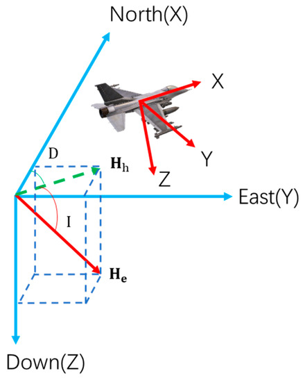 The international geomagnetic reference field (IGRF) is a general international model for describing the earth’s main magnetic field through using the longitude, latitude, and altitude information [22]. At present, this model can be used to calculate the seven elements of the geomagnetic field at any point. So, according to the IGRF model, the geomagnetic field parameters (geomagnetic field inclination I, geomagnetic field declination D, and geomagnetic field intensity ) in the geodetic coordinate system can be calculated by using the longitude, latitude, and altitude information in the aircraft GPS [23]. The aircraft coordinate system can change with the change in roll angle, pitch angle, and heading angle, so it is necessary to convert the geomagnetic field in the geodetic coordinate system to the geomagnetic field in the aircraft coordinate system, as shown in Figure 2.