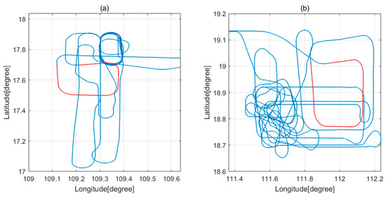 The flight experiment was conducted in the seas south of Hainan, China, in 12 and 21 July 2022. The experimental region is an open field far away from town and with a stable magnetic field. There are no interference magnetic sources, such as buildings. The aircraft platform is a Y-9 transport aircraft and a connecting rod was installed on the tail cone of the aircraft to reduce the influence of the aircraft’s magnetic field interference on the magnetic sensor. The data sampling rate is 10 Hz and filtering bandwidth is 0.04–0.3 Hz. In this experiment, the calibration flight data on July 12 are used as the calibration flight dataset to calculate the compensation coefficients. The calibration flight data on 21 July are used as the verification flight dataset, as shown in the Figure 5. For flight paths (a) on 12 July 2022 and (b) on 21 July 2022, the red part in (a) shows the trajectory of the calibration flight segment on 12 July. The red part in (b) is the trajectory of the calibration flight segment on 21 July. The flight altitude is 3000 m. The planes will perform the rolls (±10°), pitches (±5°), and yaws (±5°) in sequence on each side.