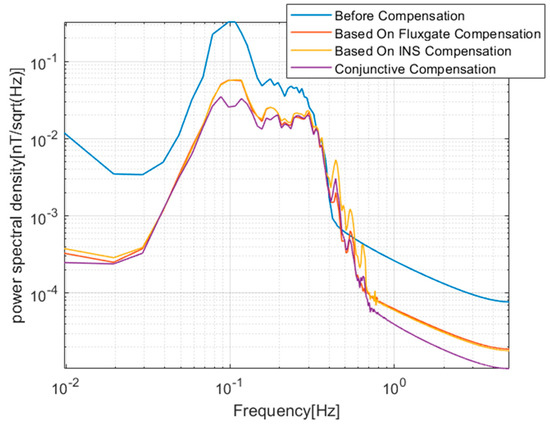 As shown in Figure 8 and Figure 9, in the 0.04–0.3 Hz band of concerning, the magnetic interference spectral density of conjunctive compensation is significantly less than that of the traditional compensation method using only fluxgate information.