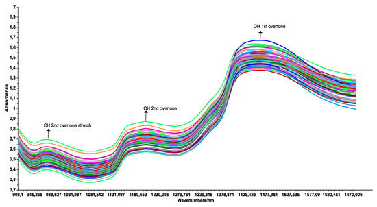 Figure 1 shows the unprocessed NIR spectra of the chili samples. Peaks were located at approximately 1450, 1190, and 970 nm, similar to that reported by Penchaiya et al. [20]. These absorption bands can be attributed primarily to the OH 1st overtone, CH 2nd overtone stretch, and OH 2nd overtone, respectively [34,35].