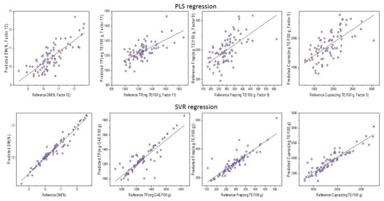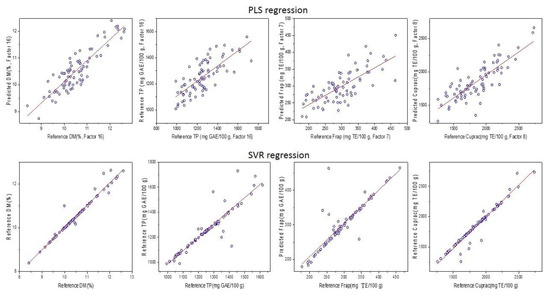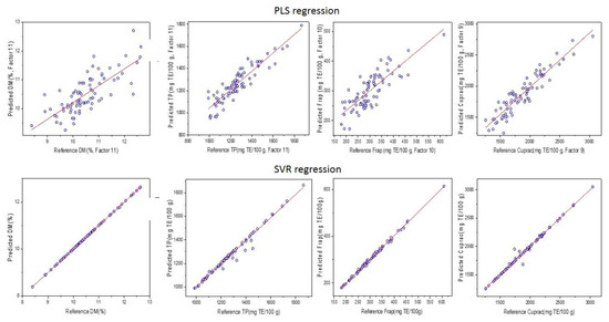 For the development of the predictive chemometric models, the data set was split into a calibration set and a validation set, comprising 80% and 20% of the sample set, respectively. Two regression methods were trialed—partial least squares regression (PLS-R) and support vector regression (SVR). PLS-R is a linear quantitative modeling algorithm that has been extensively used in spectral analysis and particularly in the infrared wavelength range (NIR and MIR). It is always used to avoid multiple collinearities by reducing a large number of independent variables into a new set of unrelated variables called latent variables (LVs). In our case, the X matrix containing the MIR and NIR spectra was used to build the PLS2 models. The response matrix Y contains four variables to be predicted, namely DM, TPC, FRAP, and CUPRAC. The number of latent variables chosen in this study is based on cross-validation using the leave-one-out cross-validation procedure [28]. Support vector analysis (SVR) is oriented from SVM (support vector machine). This method is very interesting because it can solve practical problems such as a small sample, nonlinearity, and high dimension. In this study, the SVM method was applied using linear kernel algorithms applied using nu-SVM.