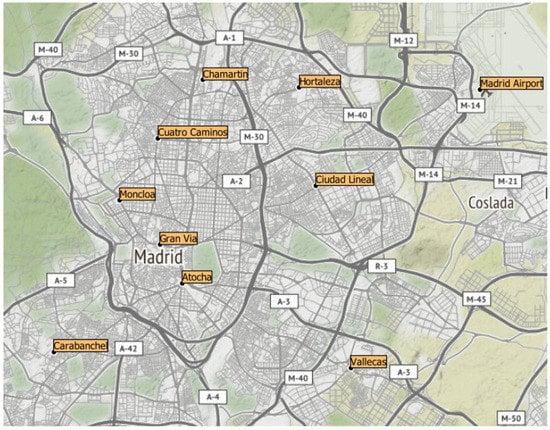 The study was conducted in the city of Madrid, which is one of the most populated cities in the European Union and has a variety of transport modes, both public and private. For a detailed description of the case study, the reader is referred to reports such as Ayuntamiento de Madrid (2021) [20] and Consorcio Regional de Transportes de Madrid (2019) [21].