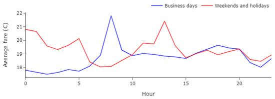 Categorical variables that control time-related features for requested trips, such as month and hour (time of day), were included to capture changes in ride-hailing fares at different times. In addition, holidays and peak hours in Madrid were verified, obtaining the variables of the business day (which does not include weekends and holidays) and peak hours (on business days from 07:00 to 09:00 and 18:00 to 20:00, according to EMESA, 2019 [29]).
