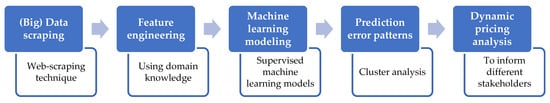 The first step includes (big) data scraping, which involves extracting information from a website and putting it into a database. The second stage includes the feature engineering technique, which involves the process of extracting characteristics, properties, and attributes from raw data using domain knowledge. These first two steps have already been presented in data collection and analysis (see Section 4).