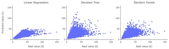 The results show that the Random Forest model has the best average performance according to the RMSE (EUR3.40) and MAPE (6.32%) metrics. Although the RMSE results do not fluctuate as much, the MAPE results show that the Random Forest model performs better than the Decision Tree and Linear Regression models. Figure 6 shows the scatterplots of real fare values versus predicted ones.