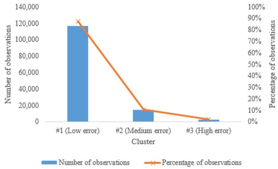 The number of observations in each cluster also shows that cluster #1 (Low error) contains 87.32% of the observations, followed by cluster #2 (Medium error) with 10.72% and cluster #3 (High error) with 1.96%. All valid observations are included in the clusters. The results show that a high share of the observations have small MAPE prediction errors (87.32%), which shows good accuracy of the machine learning models used to predict the UberX fare (the Random Forest is the machine learning model with the best performance metrics and is also one of the models contributing the most to the group with small MAPE prediction errors). Likewise, it shows a very small share of the observations with high MAPE prediction errors (only 1.96%), which can be caused by unexpected surges due to imbalances between supply and demand, as well as being related to outliers that were not removed and/or other variables (see Section 4).