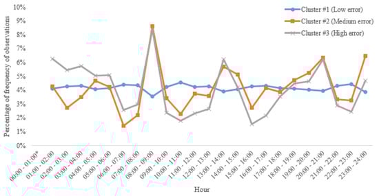 Cluster #1 (Low Error) is the one with the highest number of observations, being the frequency of observations almost constant across hours of the day, ranging from 3.52% to 4.56%. Clusters #2 (Medium error) and #3 (High error) behave in quite different ways. Despite having fewer observations, there is a greater share of high MAPE prediction errors in peak hours, the early afternoon, and late at night, which is also in line with what was presented in Figure 4.