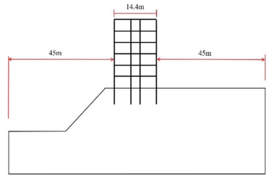 The distance between the soil’s boundary and the structure foundation’s edge is three times the width of the foundation. It can not only effectively control the calculation error of the model but also significantly improve the efficiency of the calculation. Therefore, the right pile of this structure is 45 m away from the right boundary, and the horizontal distance from the left pile to the left boundary is 45 m as well. This meets the above requirements. (Figure 1 shows the range of foundation soil.)