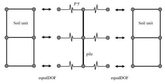 Piles connect the soil and superstructure. The connection between the soil and the pile was assumed to be rigid to simplify the calculation used in previous studies so that the relative slip of the pile and soil could be ignored. Motivated to avoid the error caused by this connection mode, the study used the pile–soil spring to connect the soil and the pile for simulation. In the finite element model, the pile and soil body were connected by zero-length nonlinear soil springs, namely p-y spring (lateral resistance) [15]. (Figure 2 is the schematic diagram of the soil spring model.)